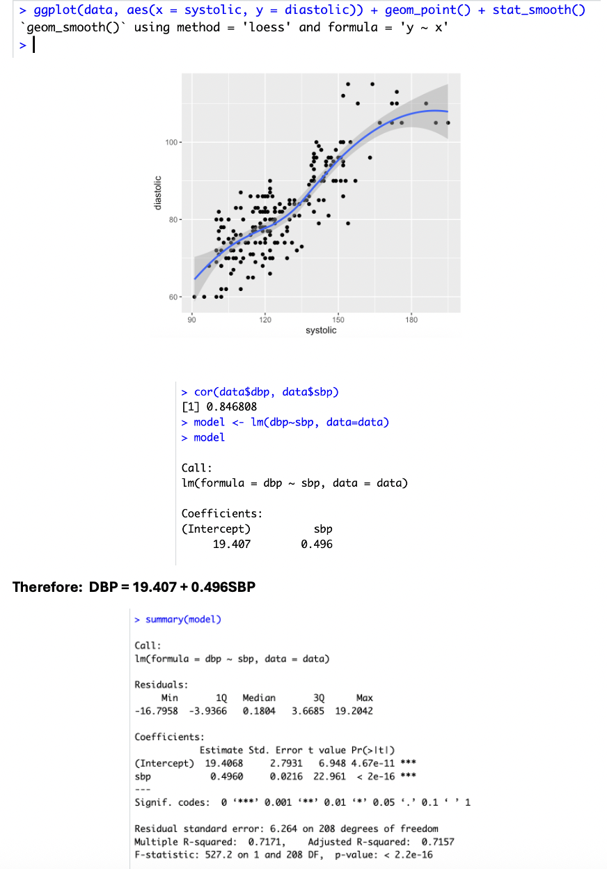 - Perform simple linear regression analysis to find the population regression equation to predict the diastolic BP by systolic BP.